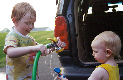 The kids "helping" with car washing.